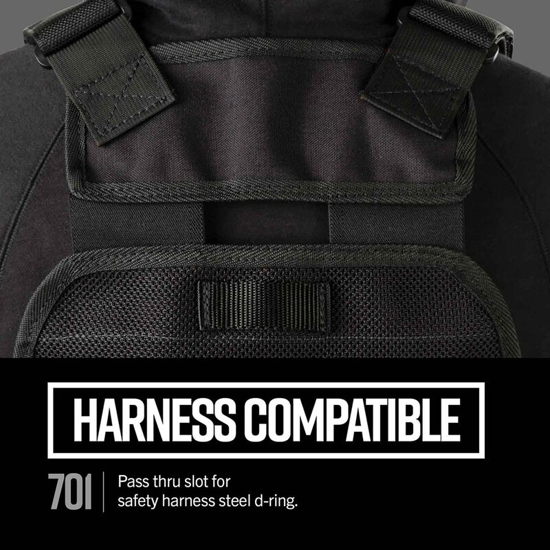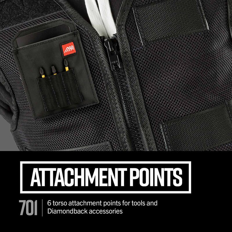 Diamondback 701 Arbeidsvest er den letteste, mest slitesterke og tilpasningsdyktige på markedet. 701 er laget av militært nylonmesh og holder deg kjølig og komfortabel hele dagen. Justerbare skulderstropper og et innebygd midjebelte erstatter ditt vanlige belte og seler, og fordeler vekten jevnt over skuldre, midje og overkropp. Fest en hvilken som helst Diamondback-lomme eller tilbehør til hoftebeltet eller festepunktene på overkroppen for å lage et tilpasset verktøybæresystem som passer perfekt til dine behov. For ekstra komfort og sikkerhet har 701 to kraftige elastiske bånd i ryggen som absorberer støt og gir enkel tilgang til tilkoblingspunktene for fallselen. Midjebeltet justeres bak, slik at du slipper en klumpete spenne som kan skade skap eller andre overflater – ideelt for snekkere, tømrere og servicejobber. Tre justeringsstropper under hver arm sikrer en komfortabel passform for de fleste brukere. Når arbeidsdagen er over, kan du enkelt oppbevare vesten i en opphengsløkke øverst. Bonus: Hver 701 Vest er utstyrt med Twiceme-teknologi. Last opp sikkerhetsinformasjonen din til Twiceme-appen via smarttelefonen din, slik at nødetatene kan få tilgang til viktige detaljer i en nødsituasjon. NB: Passer for personer opp til 195 cm.